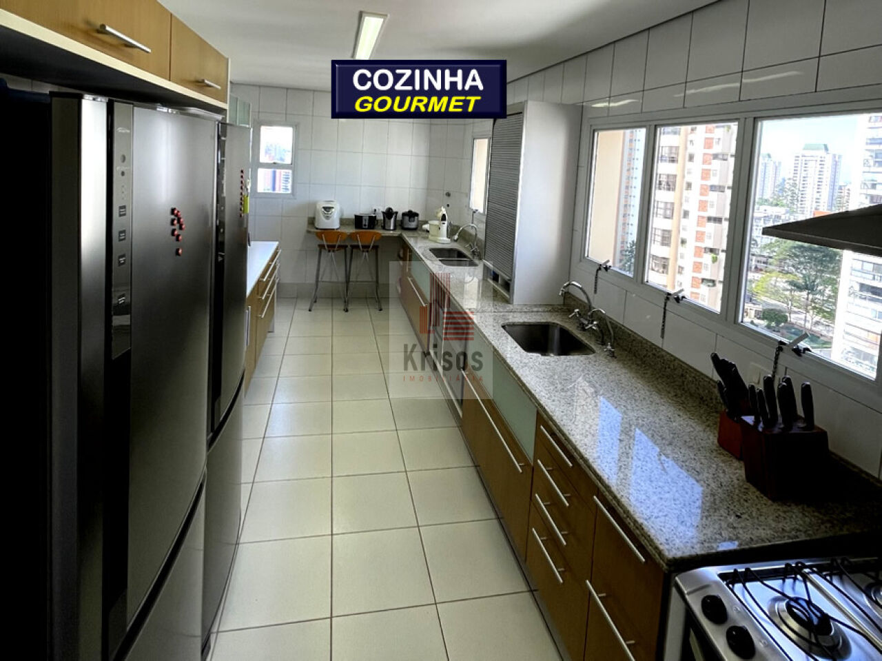 - Cozinha com bancada longa de mármore, 2 pias, espaço para 2 geladeiras, despensa.